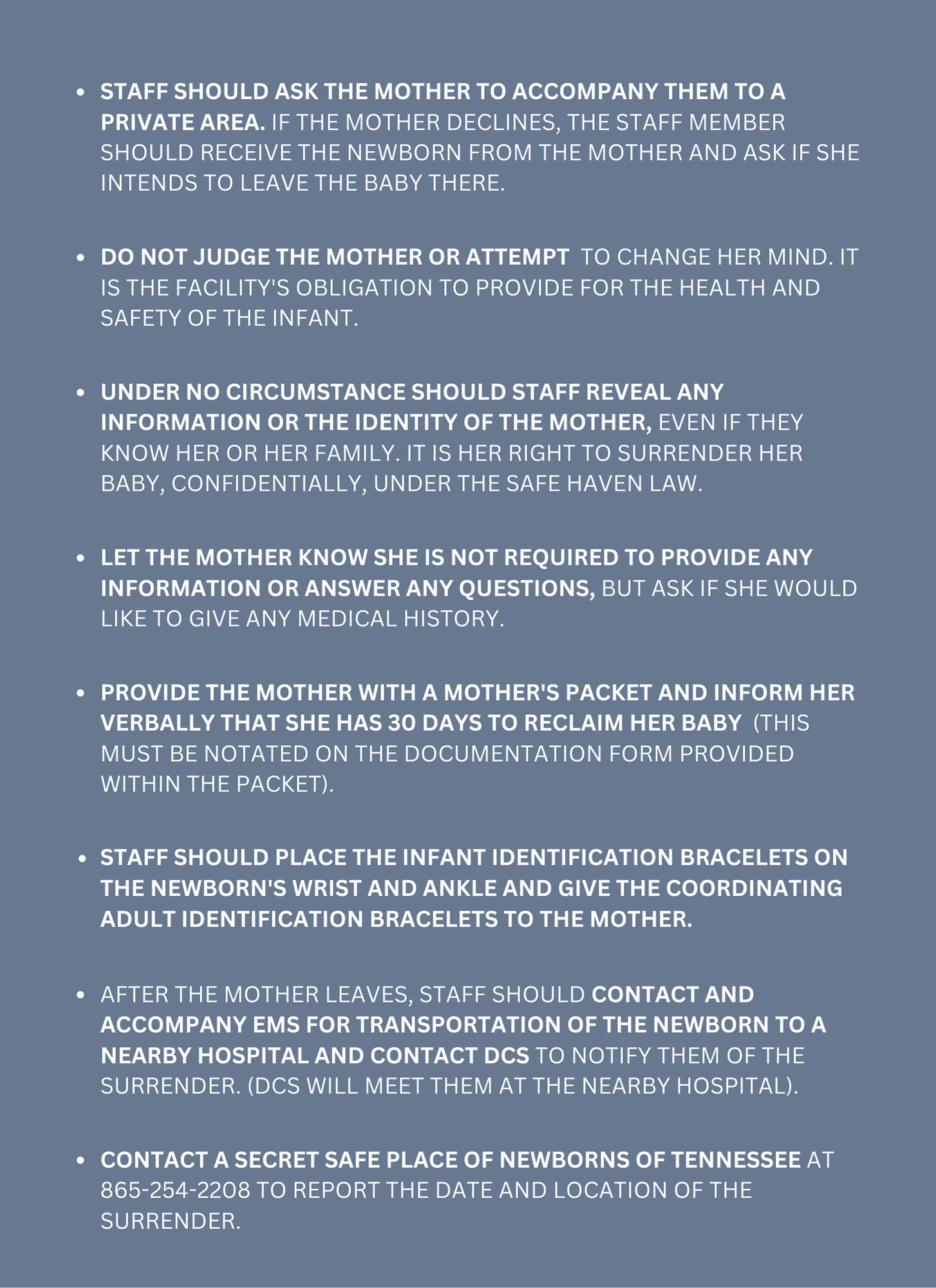 The Tennessee Safe Haven Law allows a mother to surrender her unharmed newborn, within 45 days of birth, confidentially and without fear of prosecution for abandonment, to staff at any Safe Haven facility or in a newborn safety device.